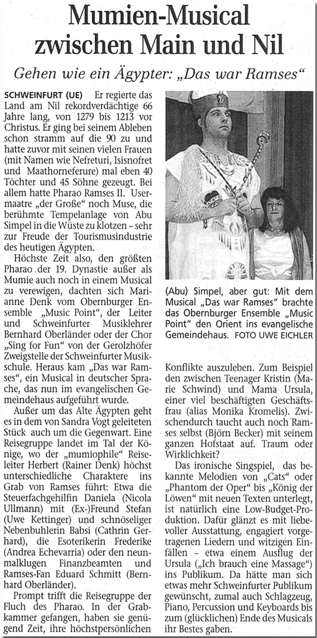 Dem Publikum wünsche ich einen auf- und anregenden Musicalabend und den lieben Freunden von Music Point drücke ich ganz toll alle beiden Daumen zu einem fulminanten Gelingen von "Das war Ramses", denn: Ohne Musik Point geht's nicht!